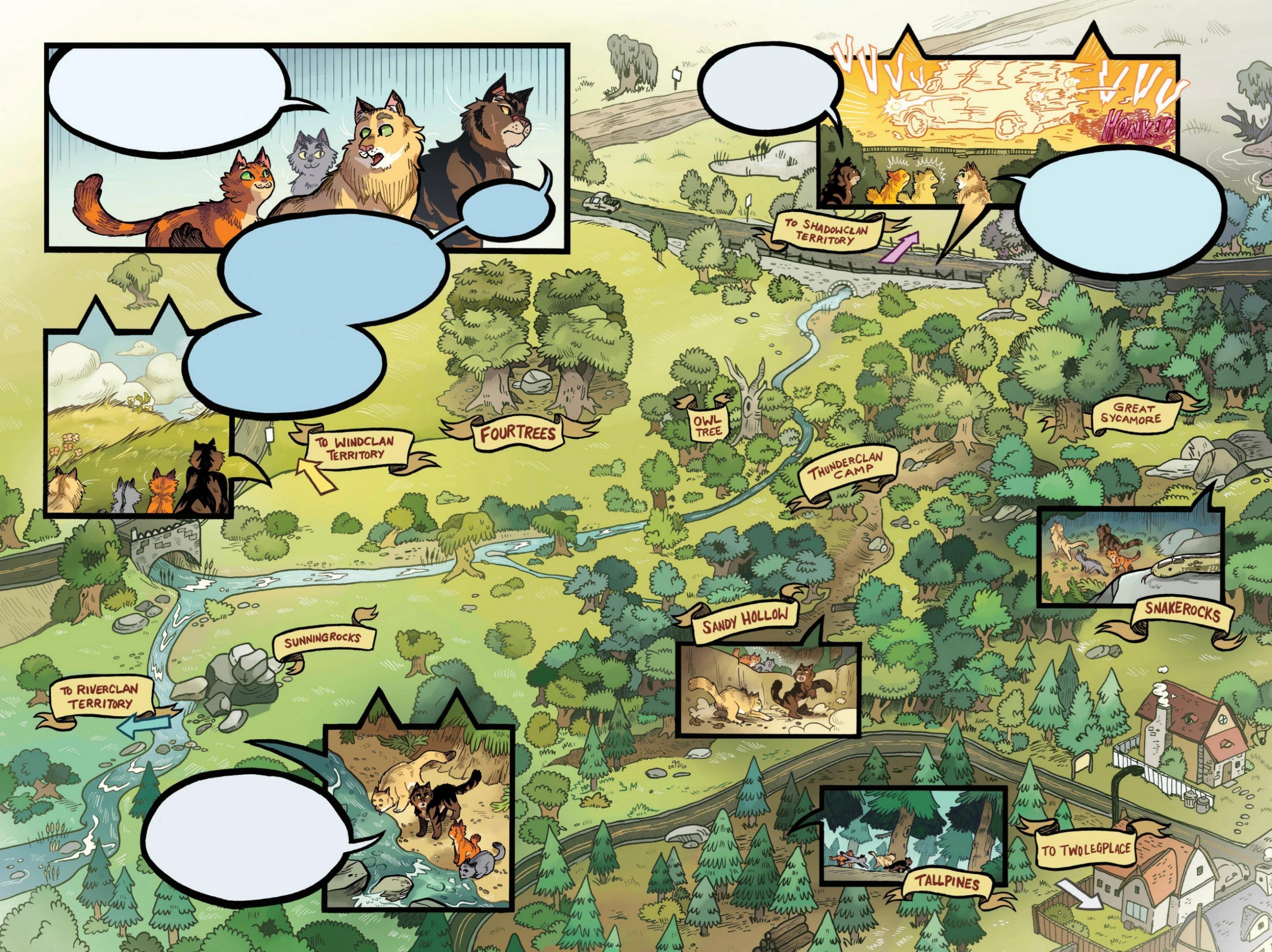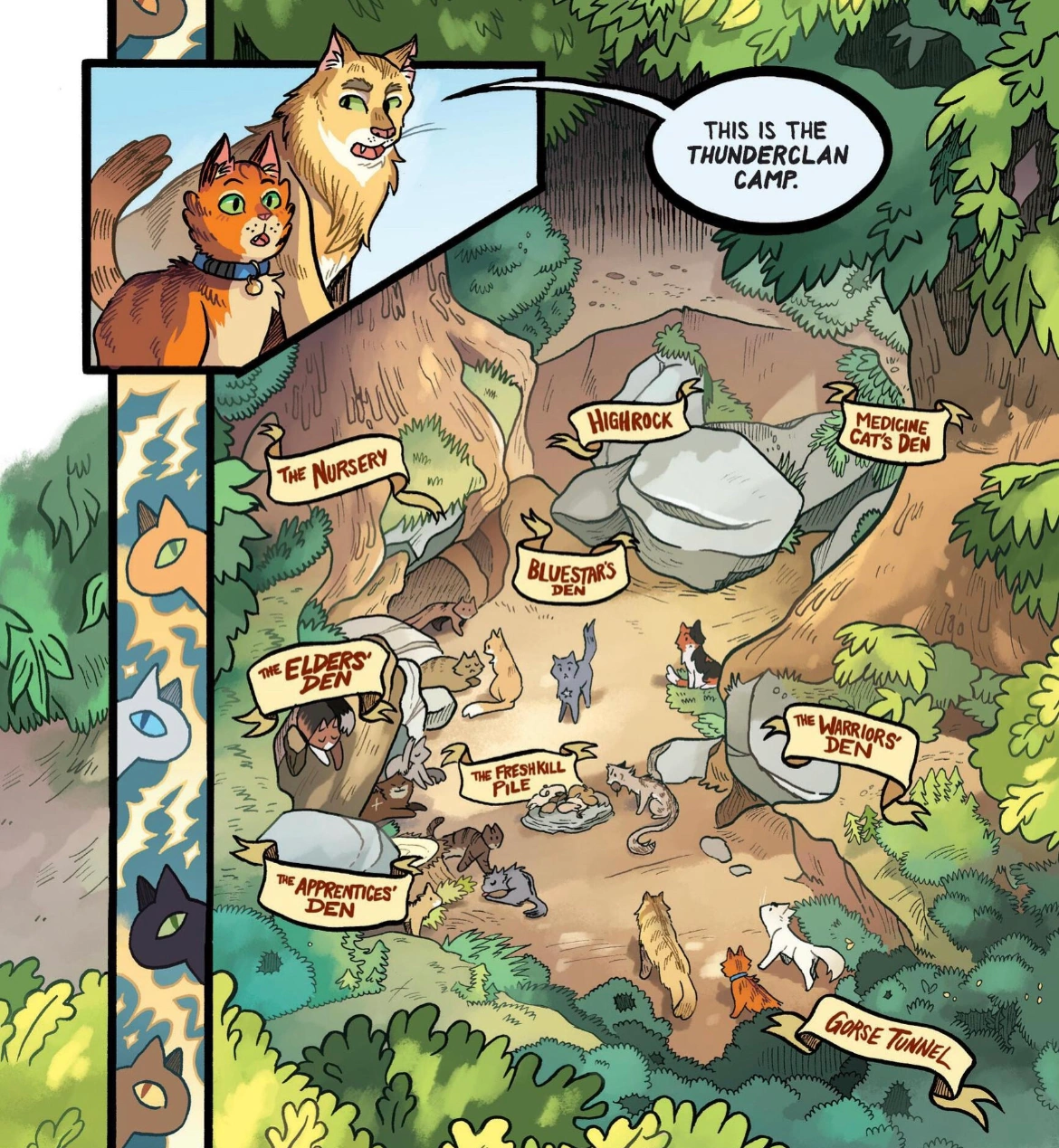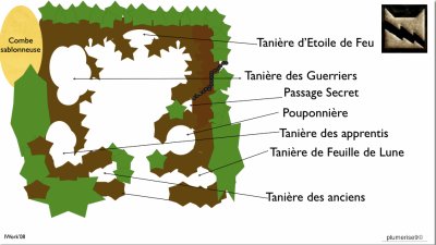 1. Le camp du Clan du Tonnerre : Abrité au fond d'un ravin sablonneux et bien protégé par une haie de ronces, ce camp est difficile à attaquer et facile à défendre.