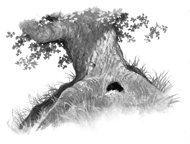 4. Le Vieux Chêne : Quand ils cherchaient de nouveaux territoires pour les clans lors de leur première visite autour du lac, Griffe de Ronce, Patte de Brume, Plume de Jais, Pelage d'Or et Poil d’Écureuil se sont abrités dans un vieux terrier de lapin sous ses racines noueuses.
